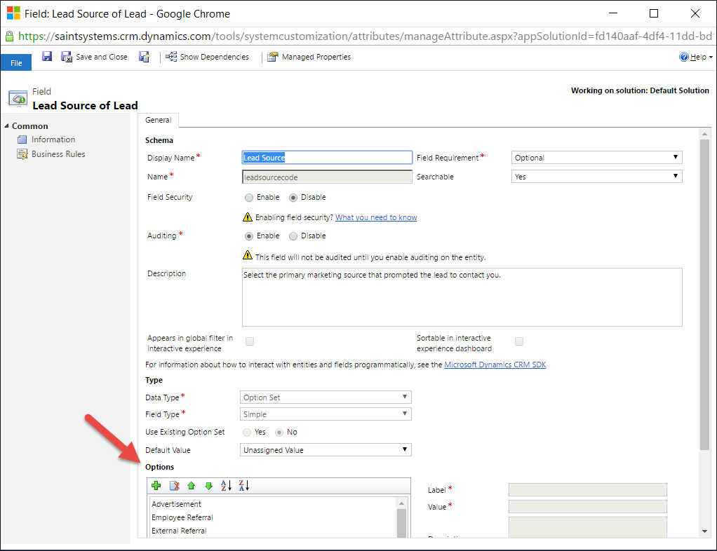 For the purpose of this article, we are going to walk through mapping the Lead Source field from the lead entity in Dynamics. The process is the same regardless of the Picklist/OptionSet field you wish to map.