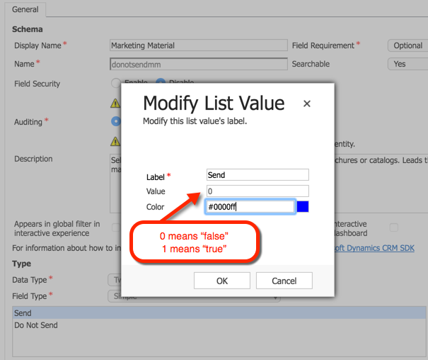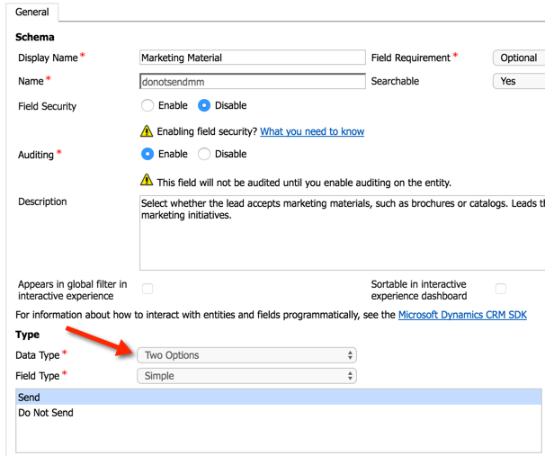 Fields with a Data Type of "Two Options" such as Marketing Materials, Email, Bulk Email and Mail work slightly differently than other OptionSet fields. These fields are actually true/false (boolean) fields with a label corresponding to true and a label corresponding to false.