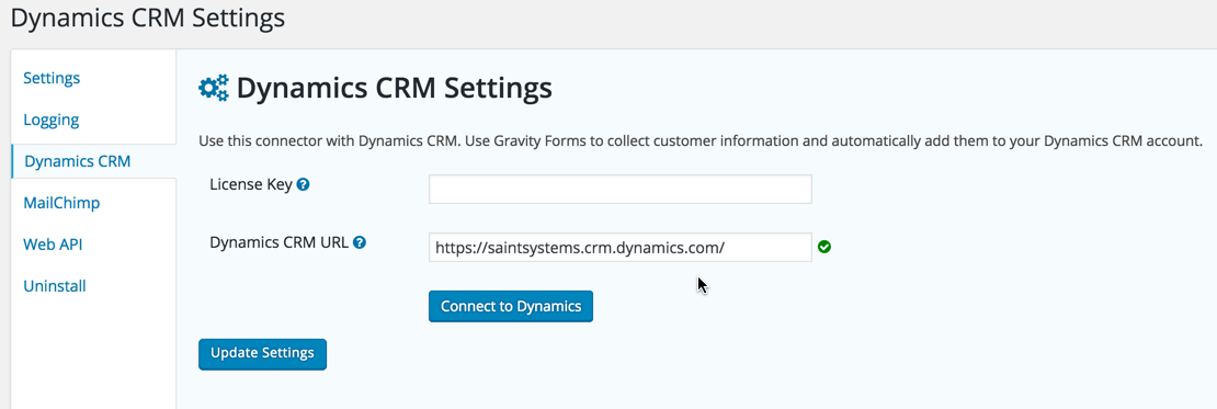 Once you have entered your Dynamics CRM URL, simply click the Update Settings button to save your settings.